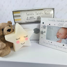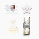 Containing handy nursery keep sakes in neutral shades, this new born gift box takes care of things inside and outside of the nursery. Here in this collection, the door to baby's new room will be accentuated with a beautiful door hanger. For inside this nursery, we have included a photo frame for precious first photos, along with a subtle night light for sweet dreams and a height chart to track baby's growth. Perfect as a Baby Shower Gift Box or New Parent treat.